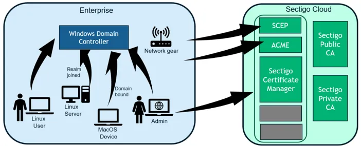 You probably have users and devices on a variety of operating systems in your environment. For non-Windows clients, such as Linux servers, MacOS devices, and networking gears, you can use Sectigo’s SCEP server to enroll certificates automatically. For many web servers such as Apache, Nginx, and others you have the option of using the ACME protocol.