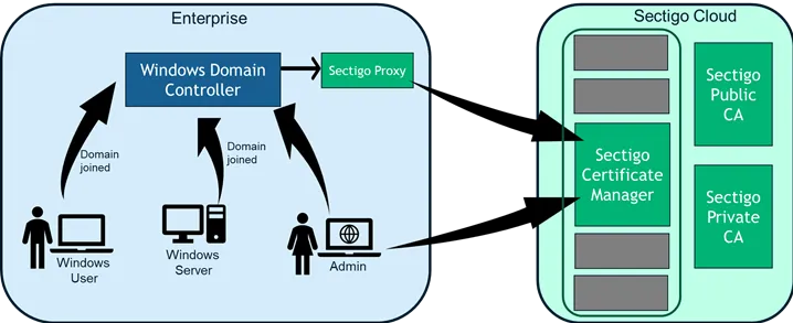 In order to introduce automation in your network, you do not want to disrupt your existing environment too much. You may already have auto-enrollment and auto-renewal set up in your Windows environment using the Microsoft CA. While this takes care of your internal (private) certificates, you will have to choose another vendor for your publicly trusted SSL/TLS certificate needs. Why deal with the overhead of managing multiple vendors? Sectigo can provide you a one-stop shop for everything. You drop a Sectigo Proxy in your Windows Active Directory server and start issuing both public and private certificates from us.