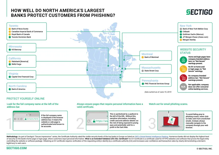 In our latest Secure Impressions: Online Banking Study, Sectigo reveals how well the largest banks in North America and Europe ensure and demonstrate security of customer data on their online banking websites. Sectigo rated websites based on the presence of SSL certificates, which confirm that a website is authentic and legitimate. We found that a notable percentage of banks left customers vulnerable to phishing scams, but that there is some good news: every bank studied had some form of SSL certificate on its home and login pages.