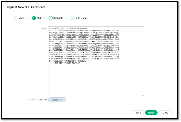 - Go to CERTIFICATES —> SSL Certificates, and click on Add. Follow the wizard, select Manual creation of CSR option (for this exercise), copy a CSR that you created with OpenSSL or any other available free tools (such as, this one: https://csrgenerator.com/ ) and complete the remaining steps. You will be able to view the newly created SSL certificate request in the CERTIFICATES —> SSL Certificates page. Select it, click on Approve and within a few seconds, you will be able to retrieve the certificate by clicking on the Download button.