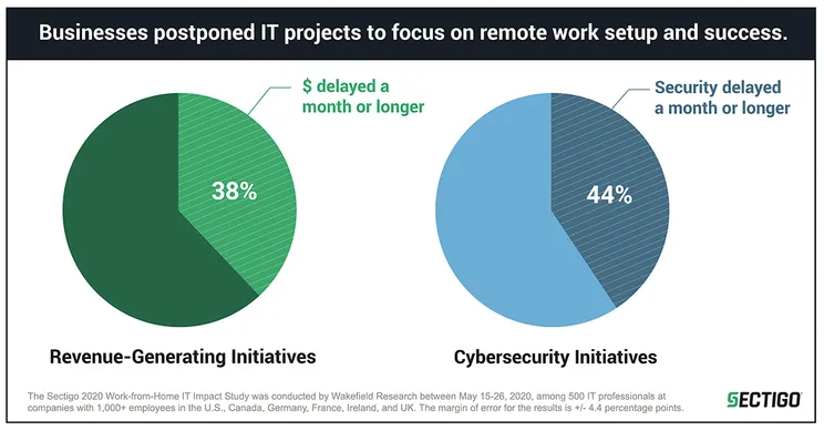 - Nearly 40% of IT professionals surveyed report that their companies delayed revenue-generating initiatives for one month (44% delayed cybersecurity projects) so that IT teams could prioritize remote work setup.