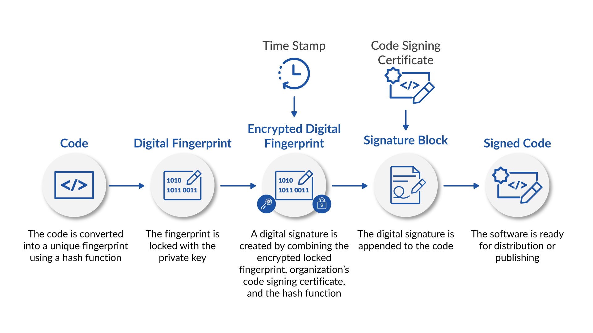 - A timestamp is applied during signing - A trusted timestamp records when the software was signed. It allows the signature to remain valid even if the code signing certificate later expires.