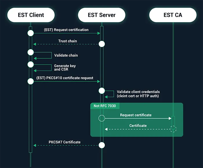 The Enrollment over Secure Transport protocol (EST) is a protocol for automating x.509 certificate issuance for public key infrastructure (PKI) clients, like web servers, endpoint devices and user identities, and for any other place PKI certificates are used, as well as the associated certificates from a trusted Certificate Authority (CA). The EST protocol is defined in RFC 7030 and standardizes an authenticated request and response exchange process with the CA, making it more secure as well as faster and easier for IT teams to deploy certificates on systems and devices than manually communicating the required information.