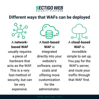 A network-based WAF usually requires a piece of hardware that acts as the WAF. They sit next to the server on the network, and all traffic runs through that machine first, then the server. This is a very fast method of security, but can be very expensive, and it is then another machine that needs to be maintained.