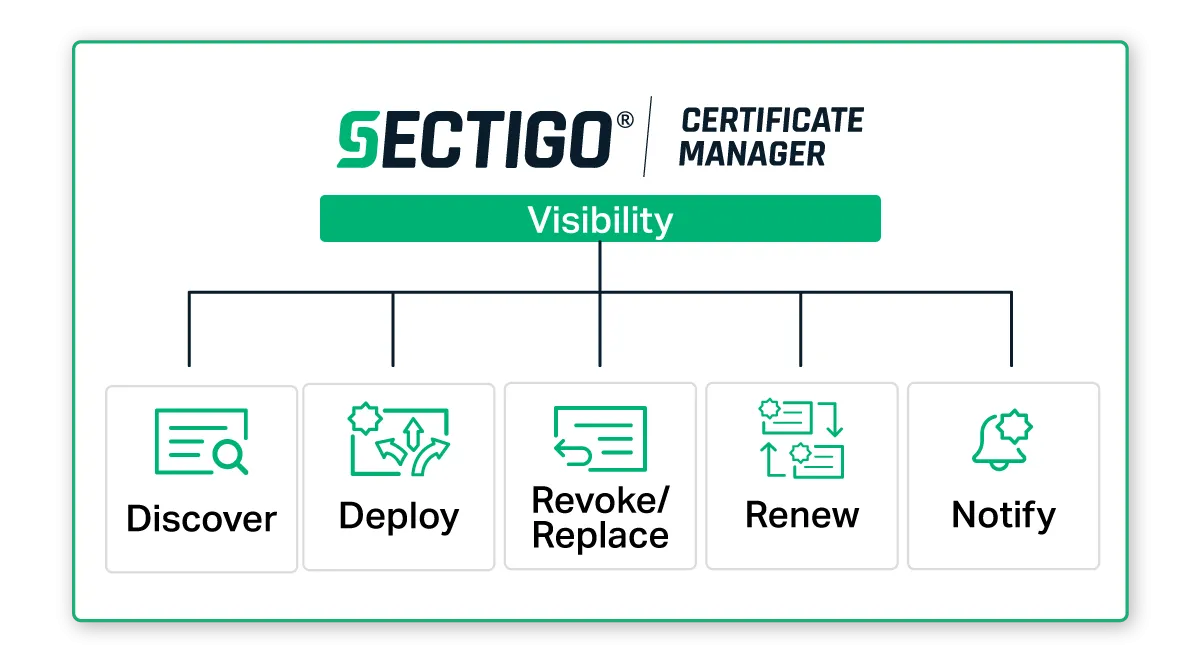 Eine wichtige Voraussetzung für jedes Zero-Trust-Modell ist die Automatisierung. Sectigo Certificate Manager bietet einen konsolidierten Ansatz für den gesamten Lebenszyklus von Zertifikaten – von der Bereitstellung und Erkennung bis hin zur Bereitstellung, Verwaltung und Erneuerung – und automatisiert wichtige Prozesse, um menschliche Fehler zu reduzieren und die Sicherheit zu erhöhen.