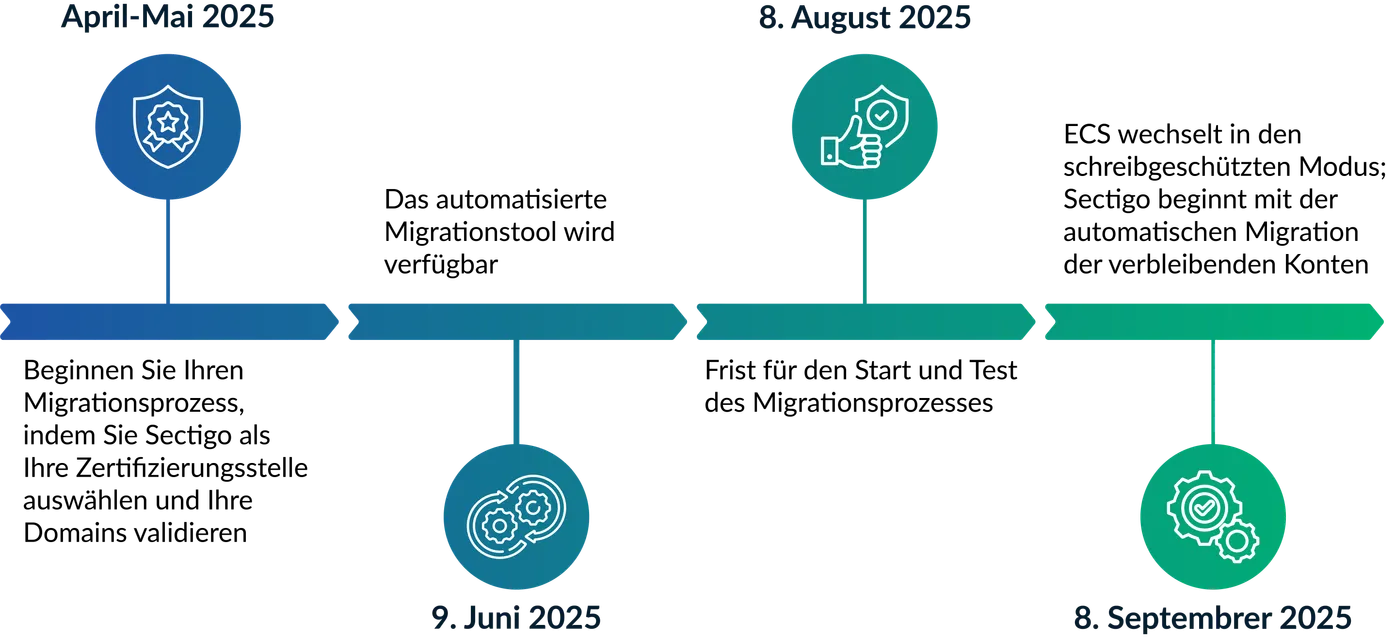Die Einstellung von ECS für die Ausstellung und Verwaltung von Public Trust-Zertifikaten ist für den 8. September 2025 geplant. Kundenkonten für ECS müssen vor dem 8. September 2025 zu Sectigo migriert werden.