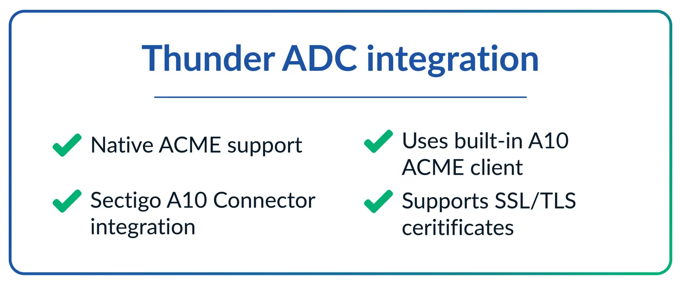 Automate the issuance, renewal and management of TLS/SSL certificates from publicly trusted certificate authorities (CAs) and existing private CAs, for the A10 Networks® Thunder® ADC series line of high-performance application delivery controllers (ADCs) using APIs.