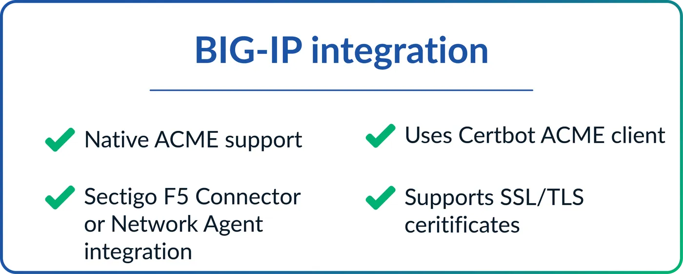 View Sectigo ACME F5 agent videoGo to View Sectigo ACME F5 agent videoView Sectigo F5 connector technical documentGo to View Sectigo F5 connector technical documentView Sectigo network agents admin guideGo to View Sectigo network agents admin guideView F5 Certbot ACME configuration documentGo to View F5 Certbot ACME configuration documentView Sectigo F5 datasheetGo to View Sectigo F5 datasheet