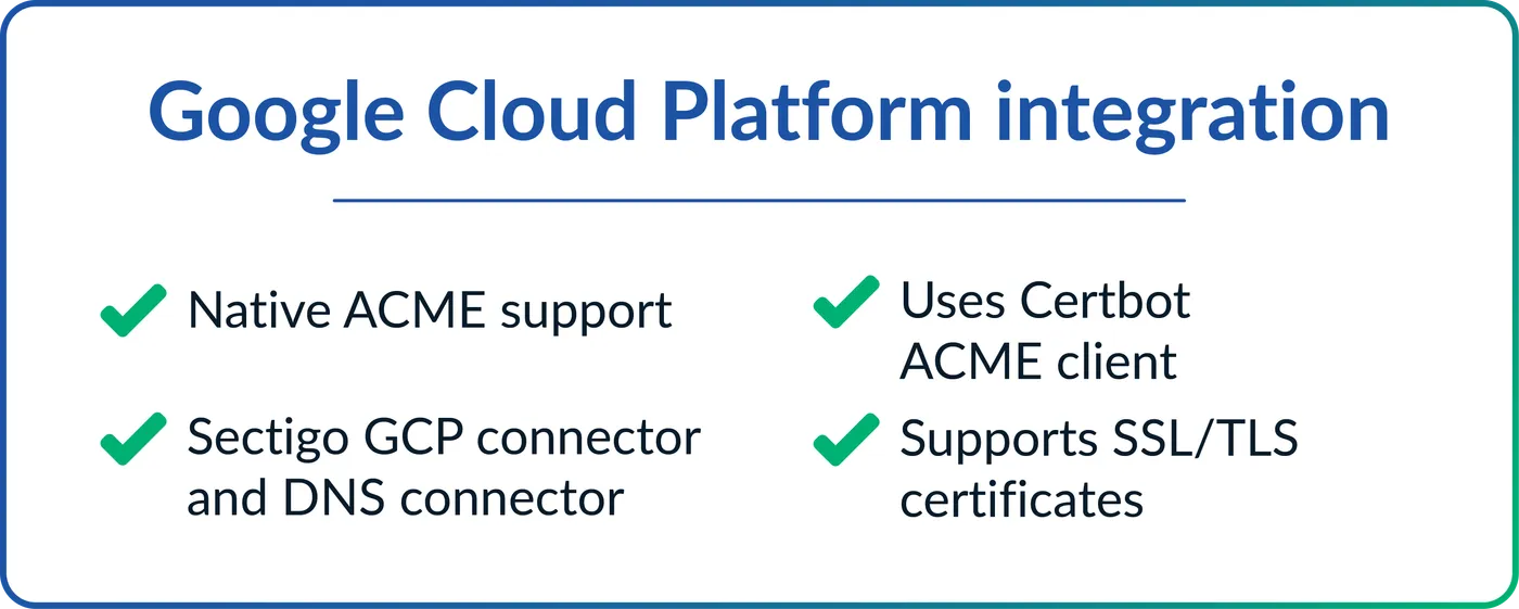 Sectigo Certificate Manager (SCM) integrates with Google Cloud Platform (GCP) to consolidate the lifecycle management of all certificates in the business under a single platform. SCM provides an integration (or connector) that enables the automated issuance and import of certificates to GCP. Orchestration tools such as Terraform and Ansible can be used to automate the deployment of those certificates into the load balancer instances.