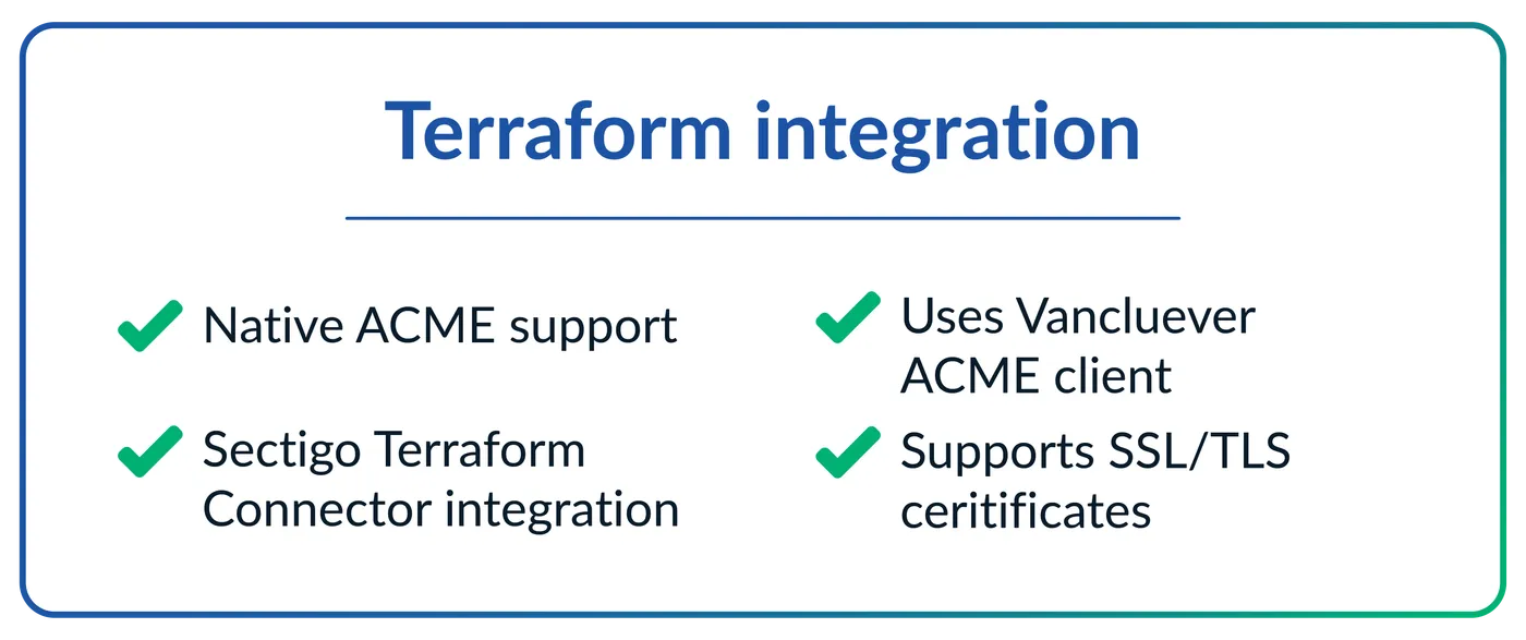 The integration also checks the validity of existing certificates and allows the issuance of replacement certificates as required. Through the Sectigo-Terraform integration, you can provision Domain Validation (DV), Organization Validation (OV), and Extended Validation (EV) SSL/TLS certificates, including SANs seamlessly. It also supports private SSL/TLS certificates issued by private CAs.