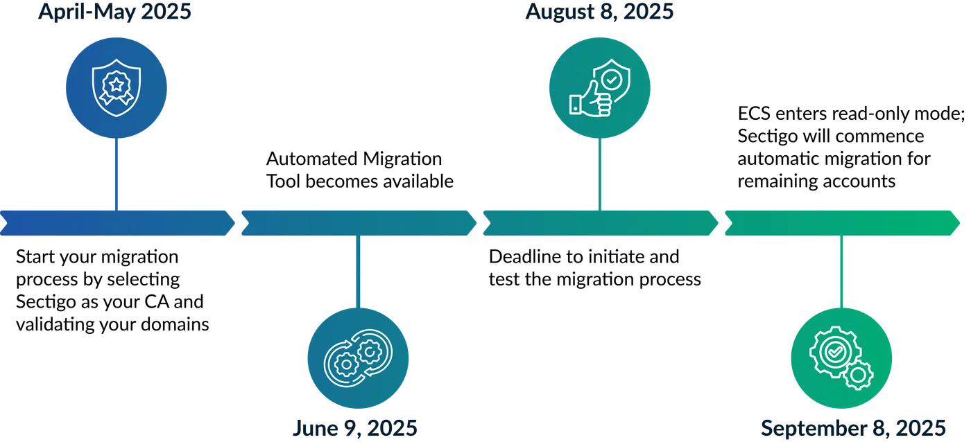 September 8, 2025: ECS will enter read-only mode, disabling new certificate issuance and account modifications. Complete your migration before this date to avoid disruption.