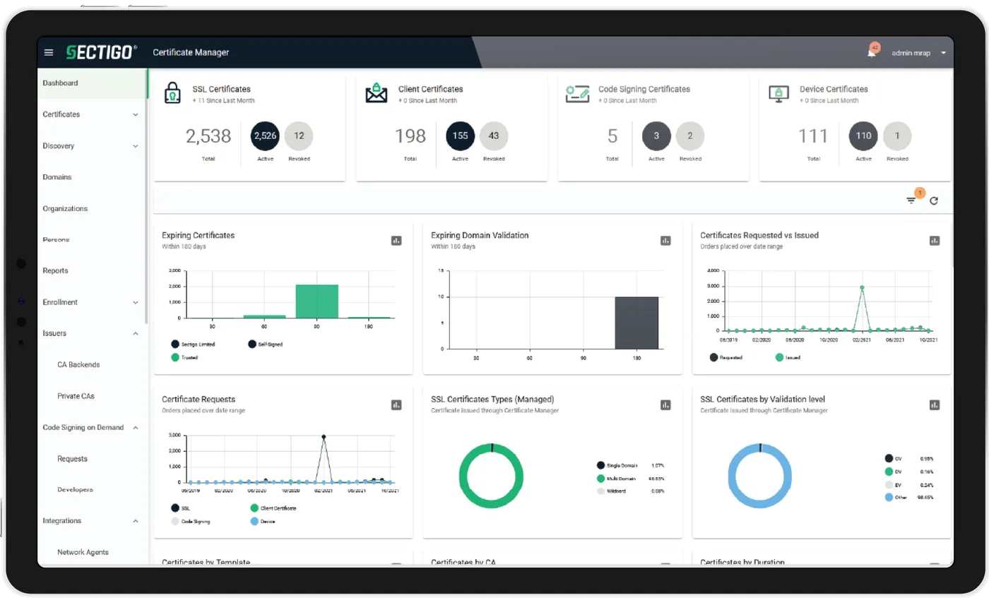 Sectigo Certificate Manager (SCM) es una plataforma universal creada especialmente para emitir y gestionar la duración de los certificados digitales, con el objetivo de asegurar todas las identidades, humanas o digitales, de su empresa desde una única interfaz. Con SCM puede automatizar la detección, emisión, despliegue y gestión de certificados Sectigo, junto con los de otras autoridades de certificación (CA) de confianza pública y CA privadas, como Microsoft AD CS, Google Certificate Authority Service y AWS Private CA.