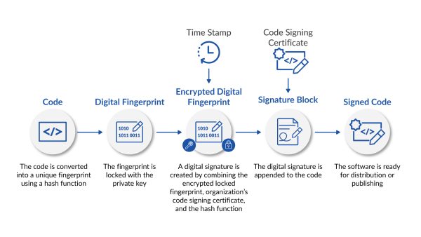 The code signing process follows a series of steps that transform software into a securely signed and verifiable software package: