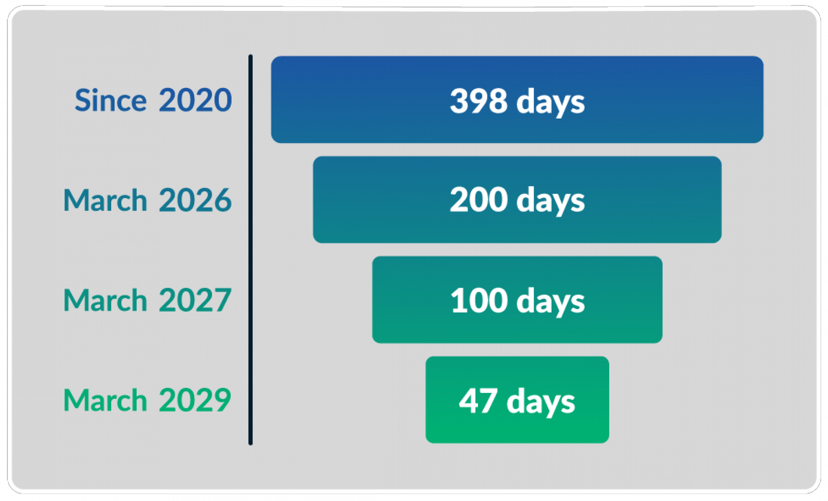 La première étape de ce changement vers une durée de 47 jours aura lieu dans moins d'un an, le 15 mars 2026. À cette date, les certificats numériques devront avoir une durée de vie maximale de 200 jours et devront être renouvelés deux fois par an.