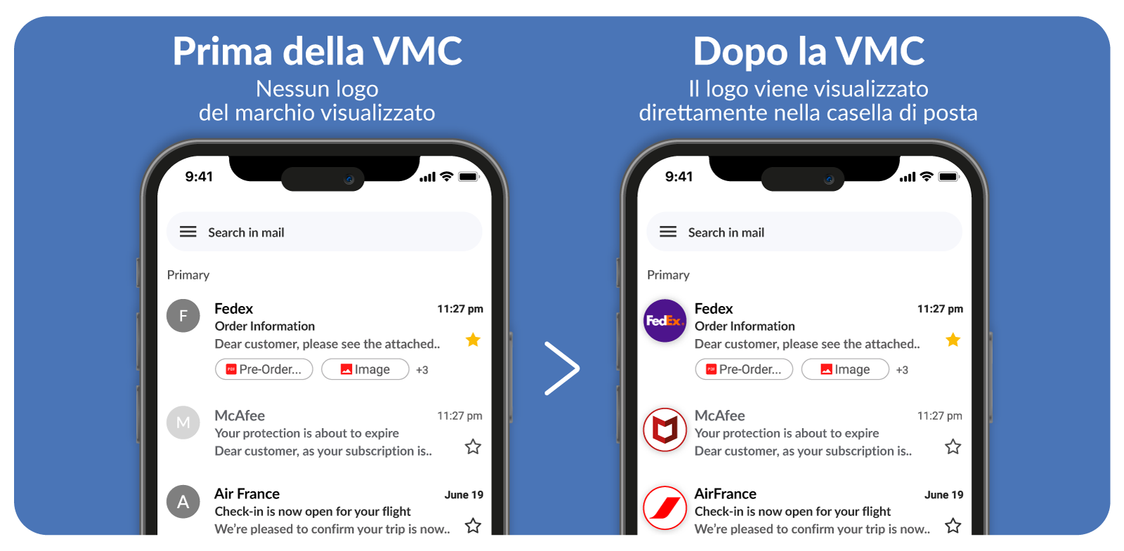 Nelle caselle di posta affollate, le tue e-mail competono per attirare l'attenzione. Un certificato di marchio verificato (VMC) aiuta i tuoi messaggi a distinguersi visualizzando il logo del marchio registrato della tua organizzazione accanto alle tue e-mail nelle caselle di posta che supportano BIMI (Brand Indicators for Message Identification). BIMI è lo standard che consente la visualizzazione del logo, mentre il VMC dimostra che il logo è ufficialmente registrato e verificato come associato alla tua attività. Con un VMC, le tue e-mail: