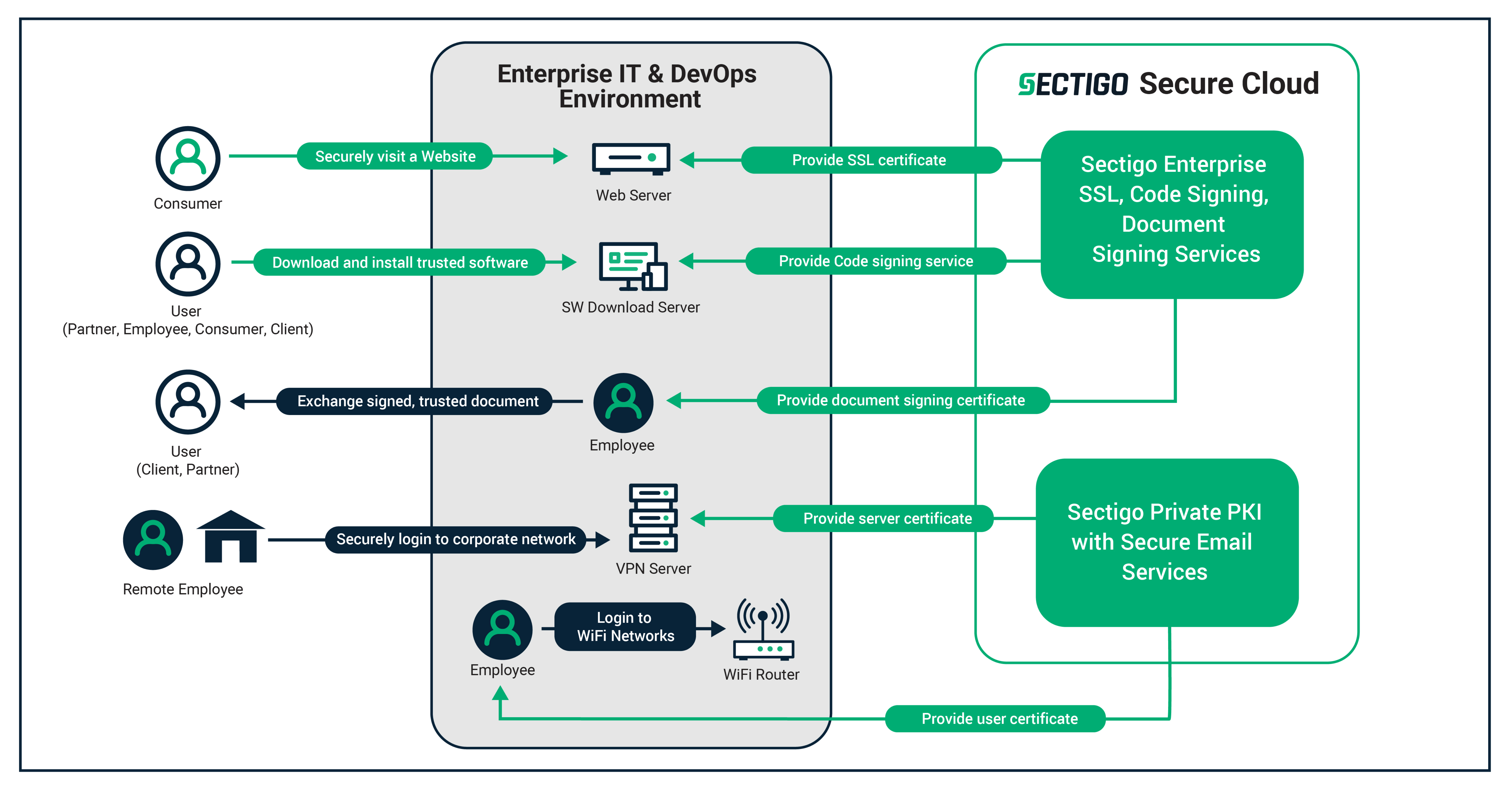 - Private PKI, which allows financial institutions to secure devices and automates the management of internal devices and applications regardless of which internal protocols an enterprise has in place, is useful for supplementing Microsoft Active Directory Certificate Services, mobile devices, IoT, DevOps, cloud/multi-cloud, web servers, SSH Key management, Private S/MIME for secure email, intranet services, WiFi access, VPN access, POS systems, networking devices, and Windows Hello for Business.