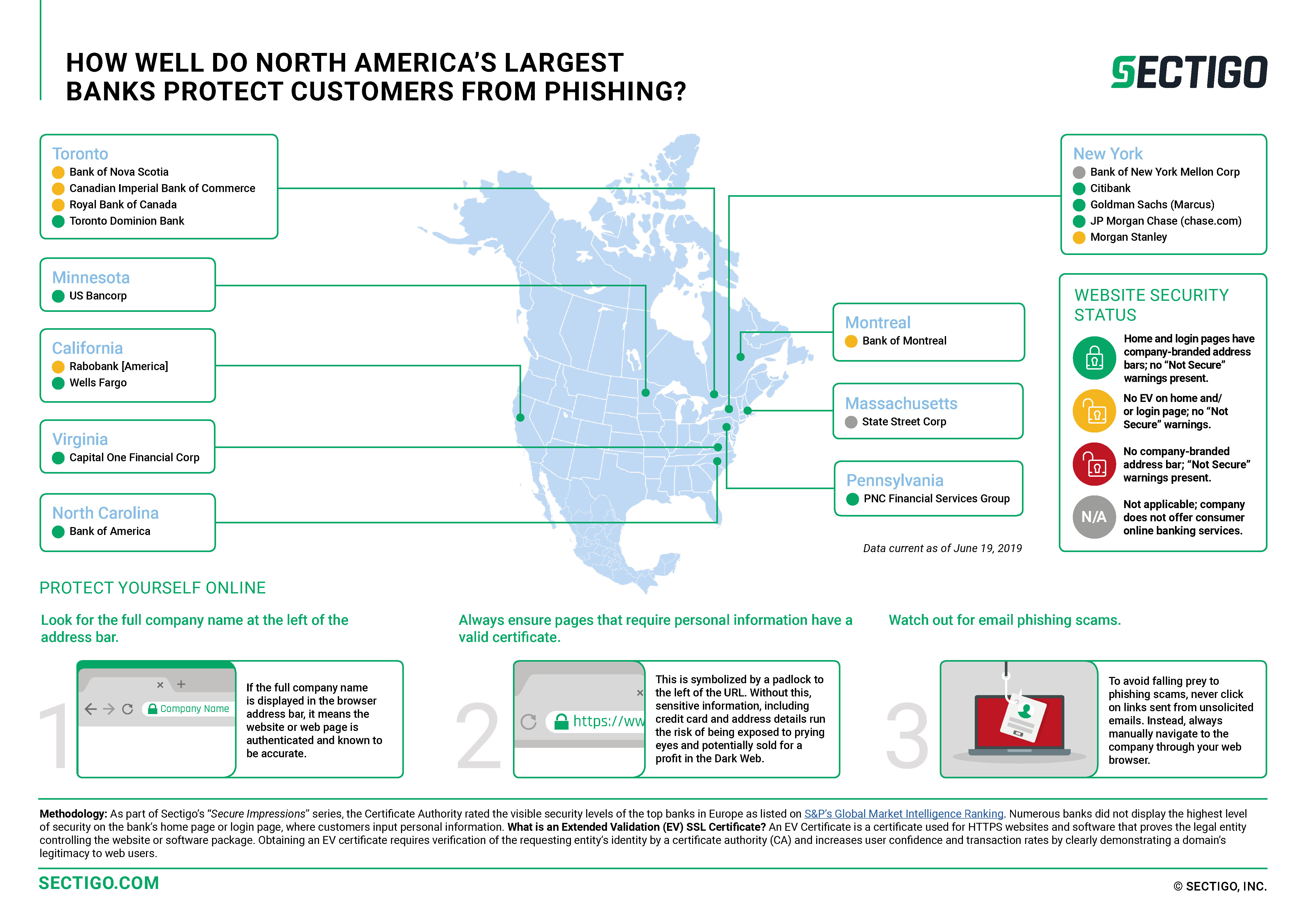 In our latest Secure Impressions: Online Banking Study, Sectigo reveals how well the largest banks in North America and Europe ensure and demonstrate security of customer data on their online banking websites. Sectigo rated websites based on the presence of SSL certificates, which confirm that a website is authentic and legitimate. We found that a notable percentage of banks left customers vulnerable to phishing scams, but that there is some good news: every bank studied had some form of SSL certificate on its home and login pages.