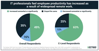 Transforming to a fully remote work environment required quick updates to technology, processes, and procedures, resulting in repercussions to revenue and cybersecurity. However, the survey revealed that despite the need to adapt to a rapidly changing work environment, IT professionals report that their organizations saw performance improvements. In fact, almost half of respondents (49%) report that employee productivity at their company has increased as a result of widespread WFH measures.