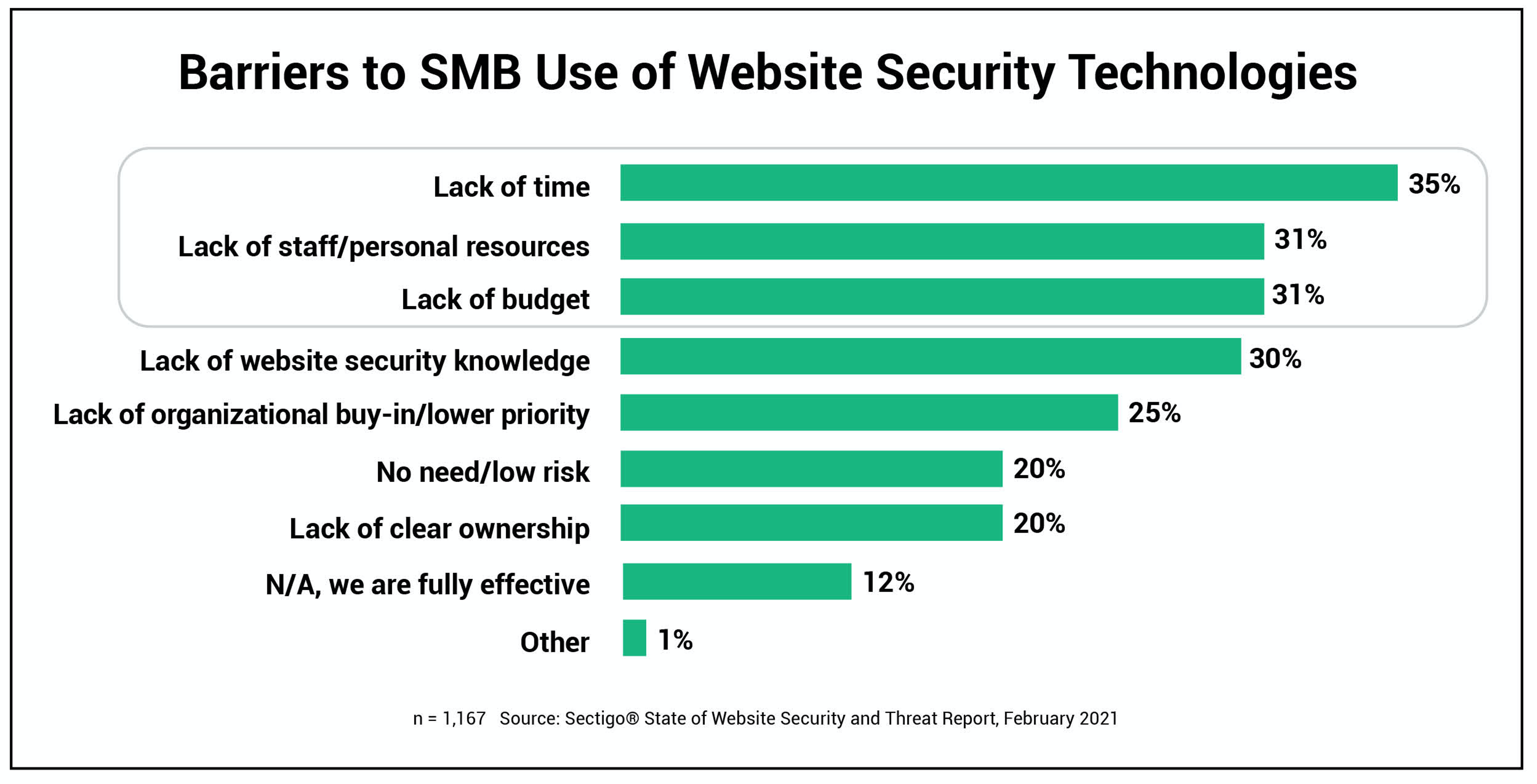 Once a website is up and running, it’s a quick thing to mark off as ‘done’ and move on to other tasks. Website security is not usually a top concern—until it’s too late. Alarmingly, nearly half (48%) of SMB leaders In Sectigo’s State of Website Security and Threat Report, January 2021 think that their organization is too small or unimportant for hackers to notice. However, the harsh reality is that any website or cloud-based system is a target.