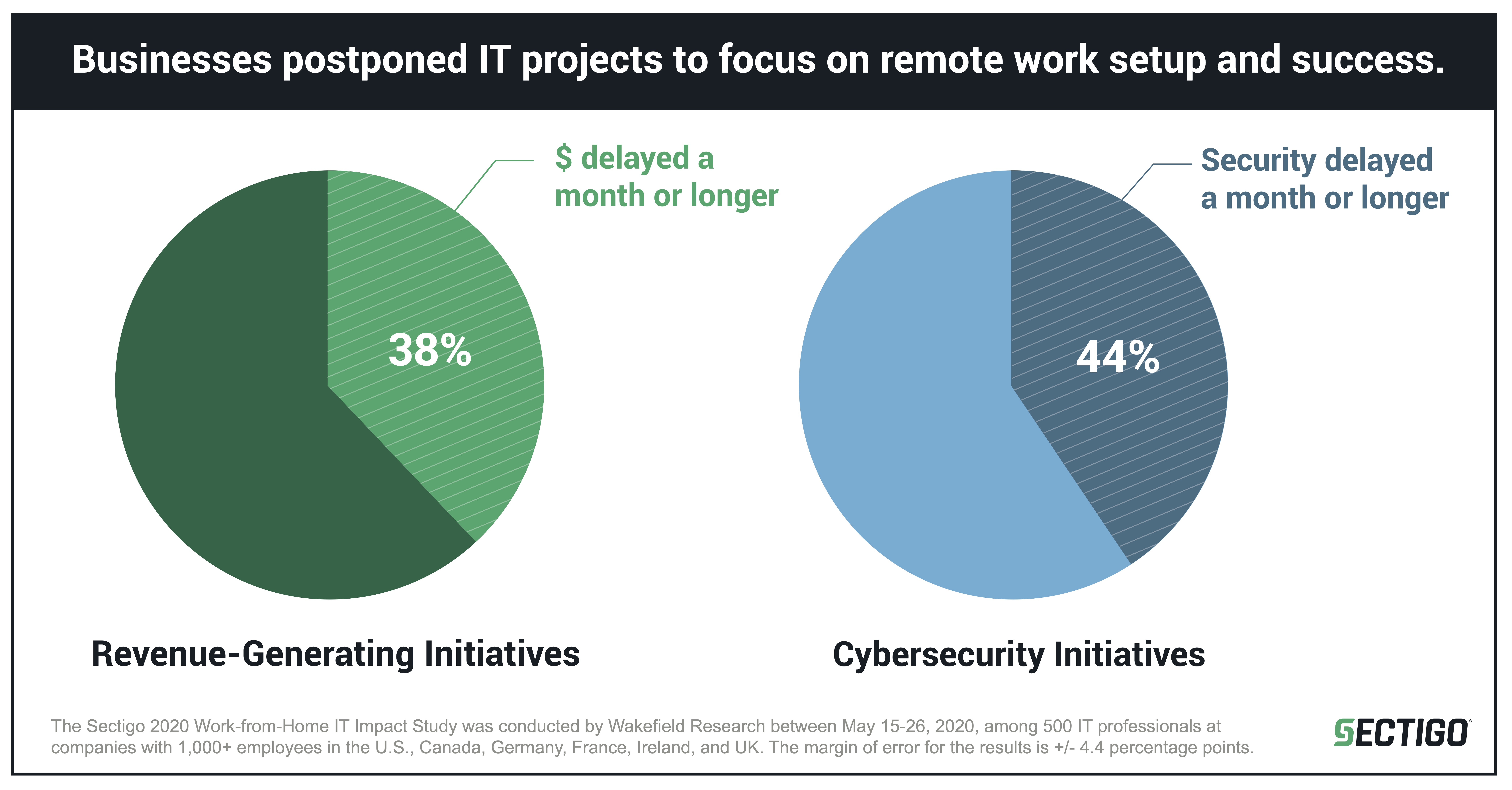 - Nearly 40% of IT professionals surveyed report that their companies delayed revenue-generating initiatives for one month (44% delayed cybersecurity projects) so that IT teams could prioritize remote work setup.